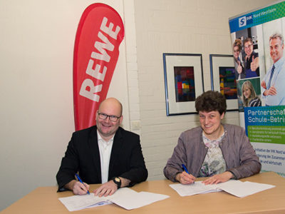 Die Verbundschule Isselburg und die Rewe Lütfring Einzelhandels OHG in Anholt sind offizielle Kooperationspartner im Projekt „Partnerschaft Schule-Betrieb“ der Industrie- und Handelskammer (IHK) Nord Westfalen. Achim Lütfrink und Birte Bublitz als Schulleiterin unterzeichneten heute eine entsprechende Vereinbarung. Inna Gabler von der IHK erklärte, dass damit die Zahl der Kooperationen im Kreis Borken auf 89 gestiegen ist. Für die Verbundschule ist es die zweite Partnerschaft mit einem Unternehmen in der IHK-Initiative. Auch für Unternehmer Achim Lütfring ist es die zweite Schulkooperation. Mit seinem Rewe-Markt in Bocholt begann er schon 2013 eine Partnerschaft mit einer Bocholter Hauptschule. Diese Zusammenarbeit wird künftig durch den Markt in Anholt weiter gepflegt.