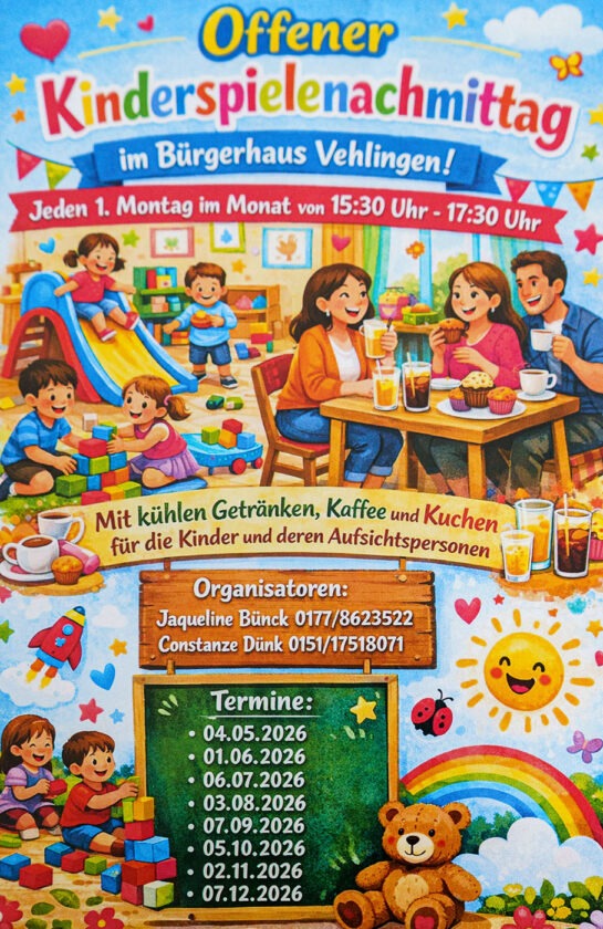 Schon seit 2013 treffen sich alle vier Wochen, jeweils am zweiten Mittwoch im Monat, Senioren im Vehlinger Bürgerhaus zu einem gemütlichen Klön- und Spielenachmittag. Nun ziehen die Kinder nach. Jeweils am ersten Montag im Monat von 15:30 Uhr bis 17:30 Uhr findet im Bürgerhaus ein offener Kinderspielenachmittag statt.